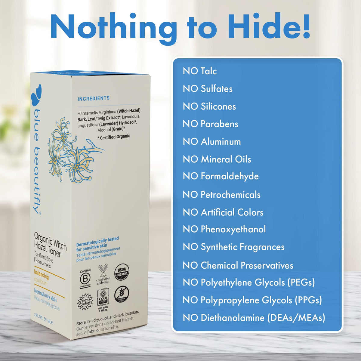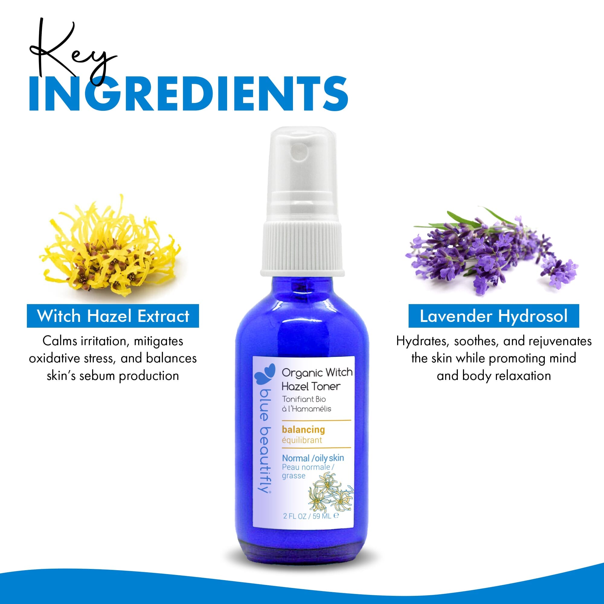 Enriched with astringent qualities, Organic Witch Hazel Toner completes the cleansing process and leaves the skin purified, replenished, and balanced.