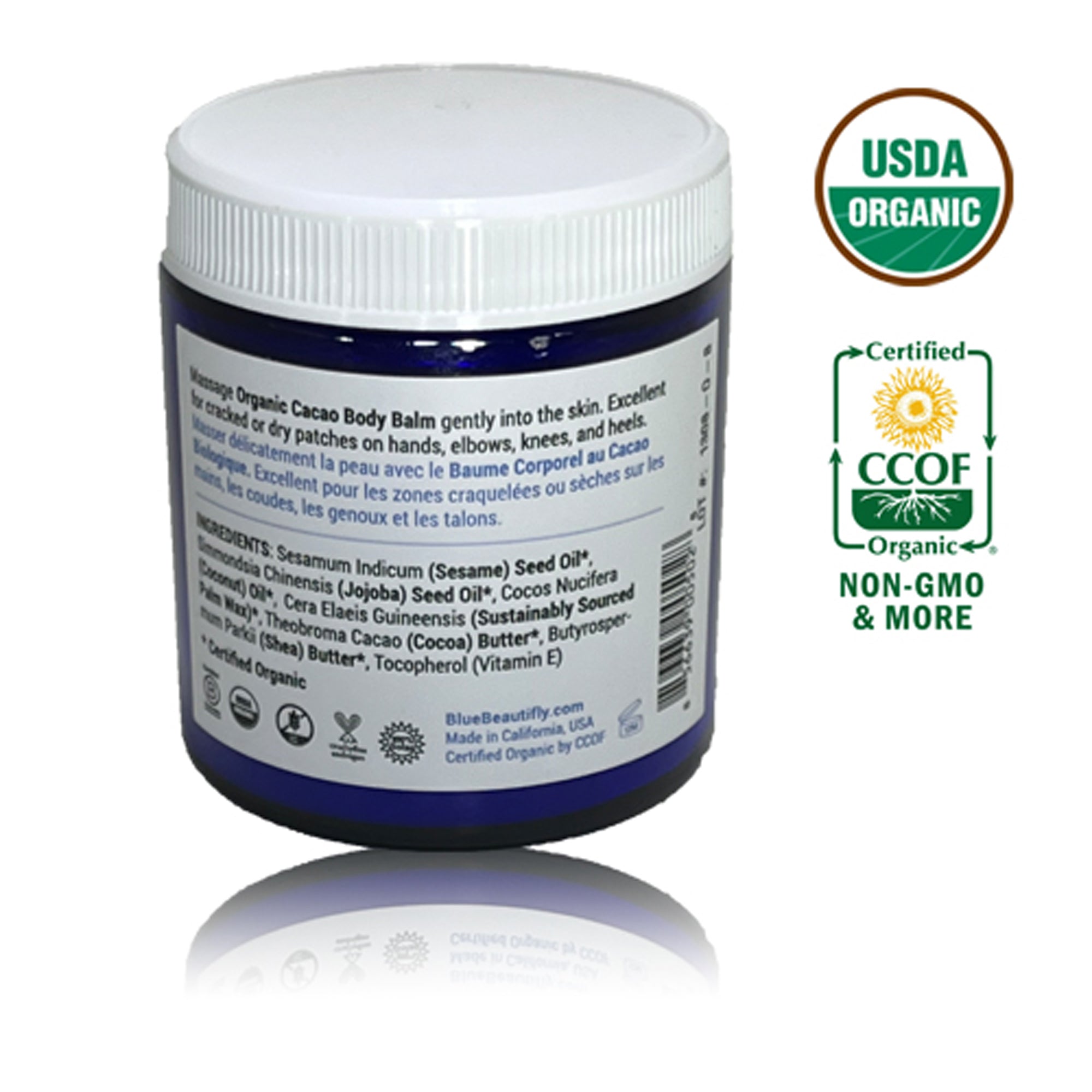 Blue Beautifly Certified Organic Body Balm contains the most nutrient-filled oils and butters for immediate results on dry, distressed, or irritated skin.​