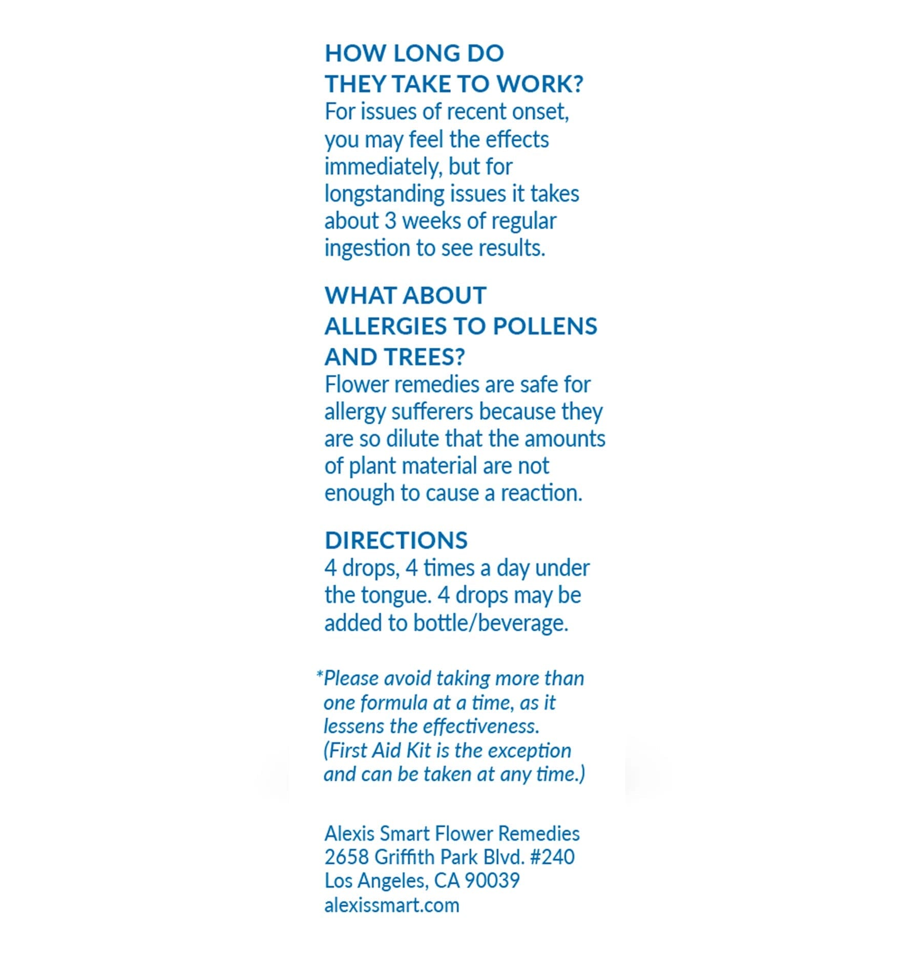Bitte vermeide die gleichzeitige Einnahme von mehr als einer Formel, da dies die Wirksamkeit der einzelnen Blütenessenzen verringert. (Die First Aid Kit Formulierung ist eine Ausnahme und kann jederzeit mitgenommen werden. Auch wenn du bereits eine andere Blütenessenz von Alexis einnimmst).