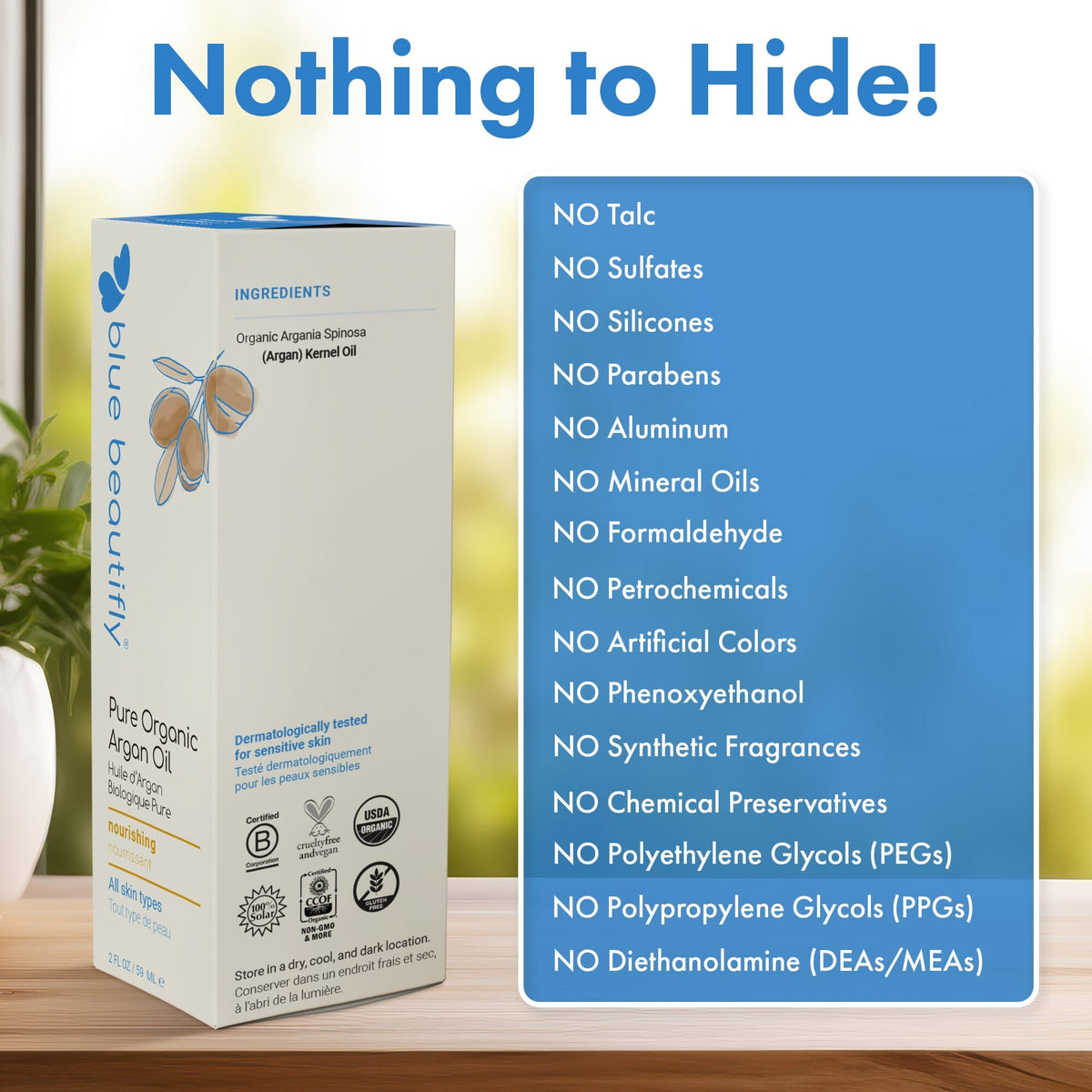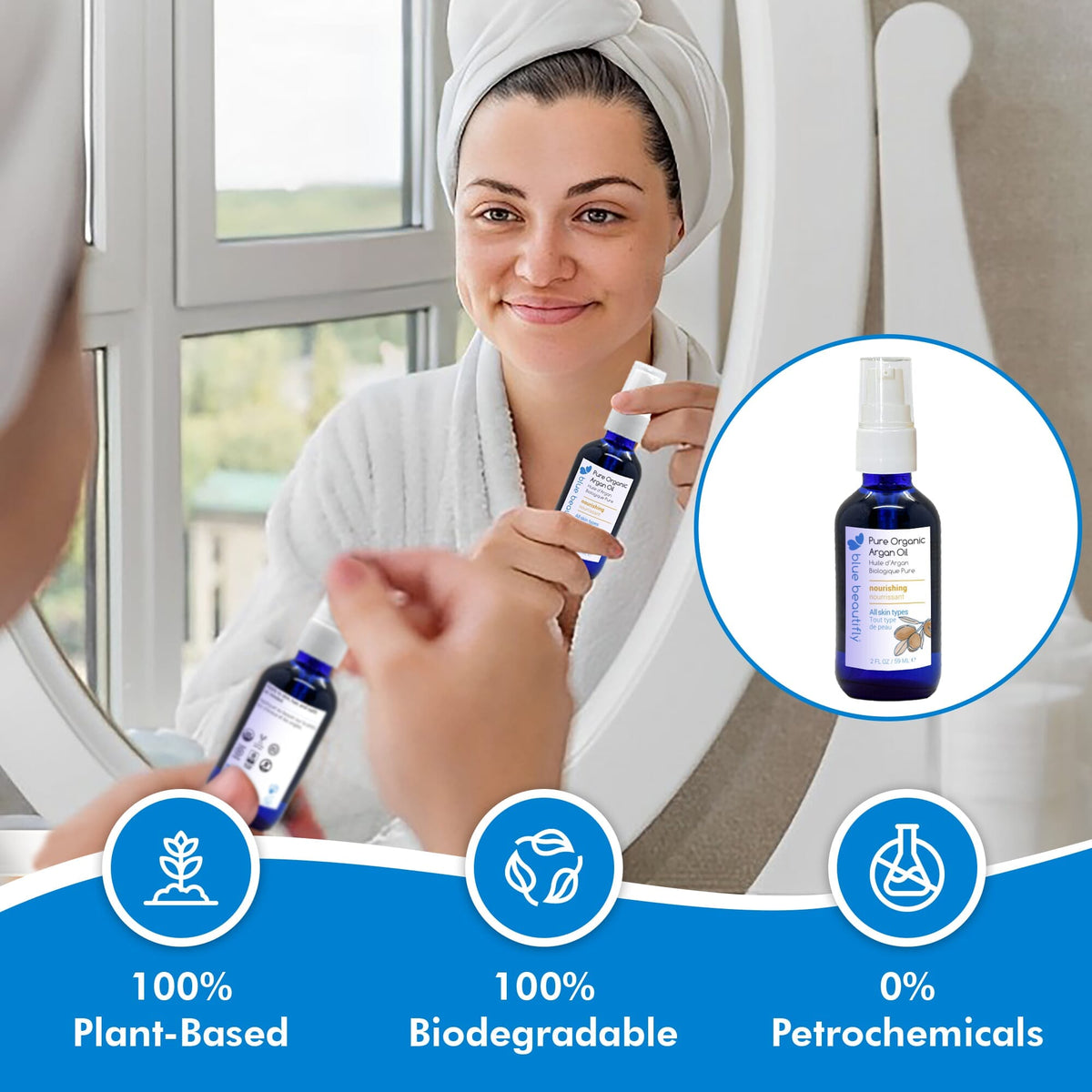 Das Pure Organic Argan Oil von Blue Beautifly versorgt deine Haut mit wichtigen Vitaminen (A & E), sowie der Omega Fettsäure 6, welche regenerierend wirken und intensiv pflegen.